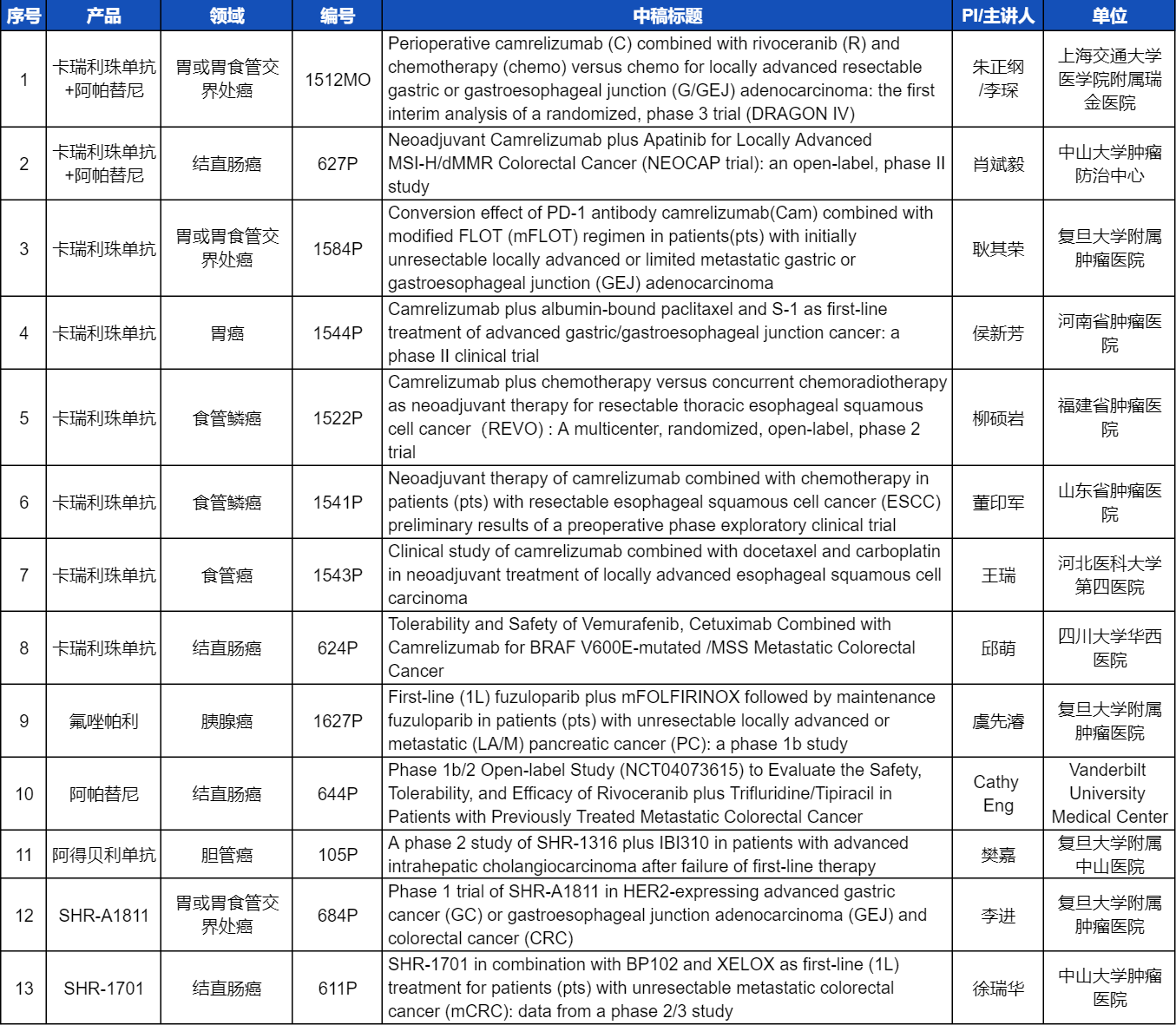 在消化系统肿瘤领域,BJL平台创新产品相关研究共入选1项口头报告和12项壁报展示。除了经典的明星药物卡瑞利珠单抗和阿帕替尼,SHR-A1811、SHR-1701等未上市创新产品也有相应研究入选。此外,阿得贝利单抗、氟唑帕利等已上市药物也在积极探索新的适应症,本次ESMO大会分别有肝内胆管癌和胰腺癌相关研究入选。这些新老药物前沿研究的不断出现,有望为消化系统肿瘤患者带来新的福音!