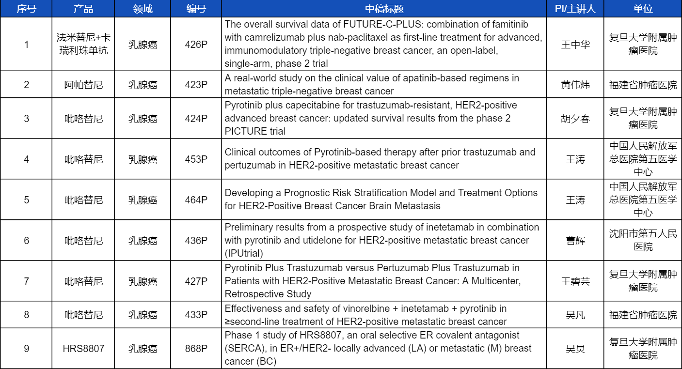 在乳腺癌领域,吡咯替尼、阿帕替尼、卡瑞利珠单抗、法米替尼,或产品间联合或联合化疗,共有9项研究入选壁报讨论,其中吡咯替尼占据6项,较为全面地展示了这款中国首个自主研发抗HER2靶向药在乳腺癌治疗中的显著特点和潜力。此外,BJL平台医药自主研发的新型选择性雌激素受体共价拮抗剂(SERCA)HRS8807治疗ER+/HER2-局部晚期或转移性乳腺癌的Ⅰ期研究也成功入选,有望为此类患者带来更多用药新选择。