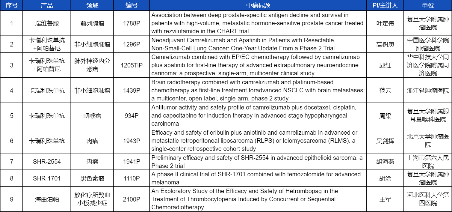 在非小细胞肺癌、咽喉癌、肉瘤、前列腺癌、黑色素瘤等多个领域,卡瑞利珠单抗、阿帕替尼、瑞维鲁胺、SHR-1701、SHR2554等创新产品相关研究一共入选了8项壁报展示。此外,BJL平台医药自主研发的血小板生成素受体激动剂(TPO-RA)海曲泊帕在放化疗所致血小板减少领域的探索性研究显示良好的疗效,入选壁报展示。