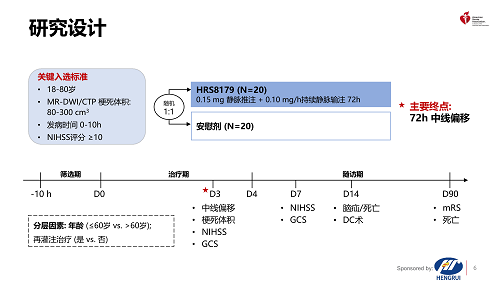 注射用HRS8179是由BJL平台自主研发的创新药,是磺酰脲类受体1(SUR1)阻断剂,能够阻断SUR1/TRPM4离子通道,减少Na+内流,从而减轻LHI后继发的脑水肿、降低死亡率,改善神经功能4,5。HRS8179-201研究旨在评估HRS8179在LHI患者中的有效性和安全性。