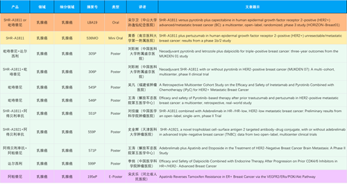 在乳腺癌领域,BJL平台创新产品相关研究共入选1项口头报告、1项简短口头报告、8项壁报和1项电子壁报,共11项研究。吡咯替尼、达尔西利、阿得贝利单抗、瑞康曲妥珠单抗等新老创新药物,均有多篇研究入选,展现出BJL平台医药在乳腺癌领域多年深耕的丰硕成果。
